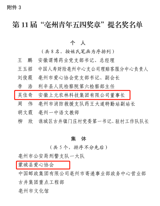 为集中展示新时代亳州青年的精神品格和价值追求,充分发挥青年典型模范带头作用,引导激励全市广大青年牢记党的教诲,立志民族复兴,在青春的赛道上跑出当代青年的最好成绩,以优异成绩喜迎党的二十大胜利召开,共青团亳州市委、亳州市青联决定,授予王小龙等10名个人第11届“亳州青年五四奖章”,利辛县政通路消防救援站等5个集体第11届“亳州青年五四奖章集体”,同时授予王鹏等8名个人和5个集体第11届“亳州青年五四奖章”提名奖。